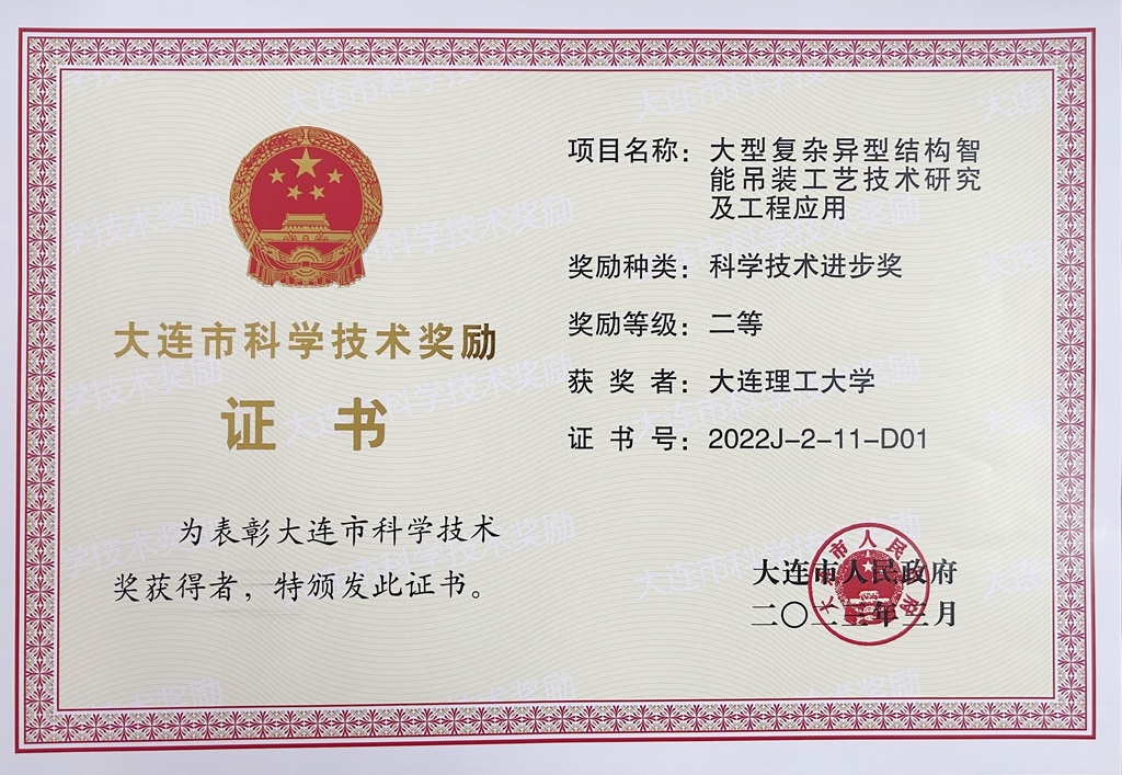 近日,实验室科技成果——“大型复杂异型结构智能吊装工艺技术研究及工程应用”荣获2022年大连市科技进步二等奖。